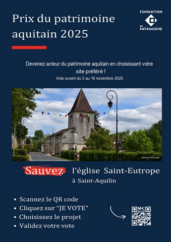 Le bâtiment historique inscrit de notre commune de Saint-Aquilin " l'église Saint Eutrope" a été sélectionné pour représenter la Dordogne au Prix du Patrimoine Aquitain, organisé par la Fondation du Patrimoine.