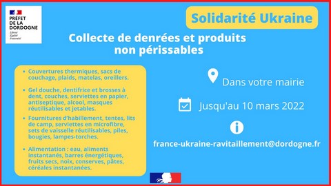 Si vous avez la possibilité d’offrir un hébergement, ou si vous souhaitez faire des dons en matière de nourriture ou d’équipements merci de nous le signaler en mairie.