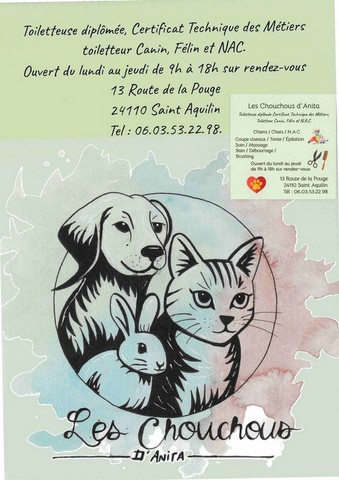 Nouvelle activité à saint aquilinouverture à partir du 05 janvier 2026, du salon de toilettage "les chouchous d'anita"13 route de la pouge, 24110 saint aquilin