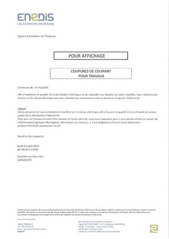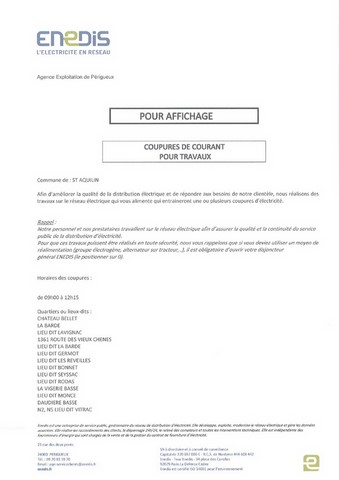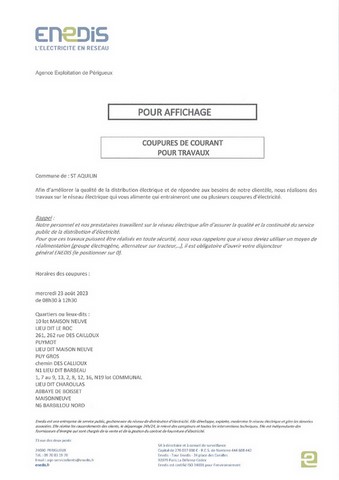 Des travaux sont prévus avec plusieurs coupures d'électricité le JEUDI 8 JUIN 2023 de 9H30 à 15H30 sur les lieux-dits :