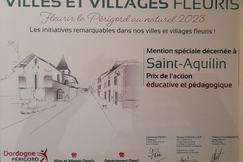 Le département "Villes et villages fleuris" a décerné une mention spéciale à notre village de Saint-Aquilin avec le prix de l'action éducative et pédagogique 2023.