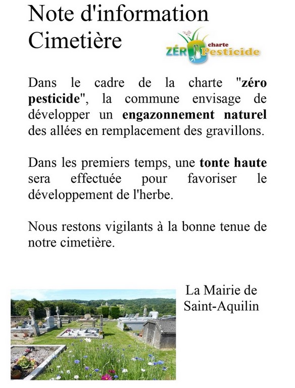 Le cimetière reste ouvert en permanence, cependant les portes doivent être refermées après chaque utilisation afin d’éviter toute divagation d’animaux ; la commune ne possède ni gardien, ni fossoyeur.